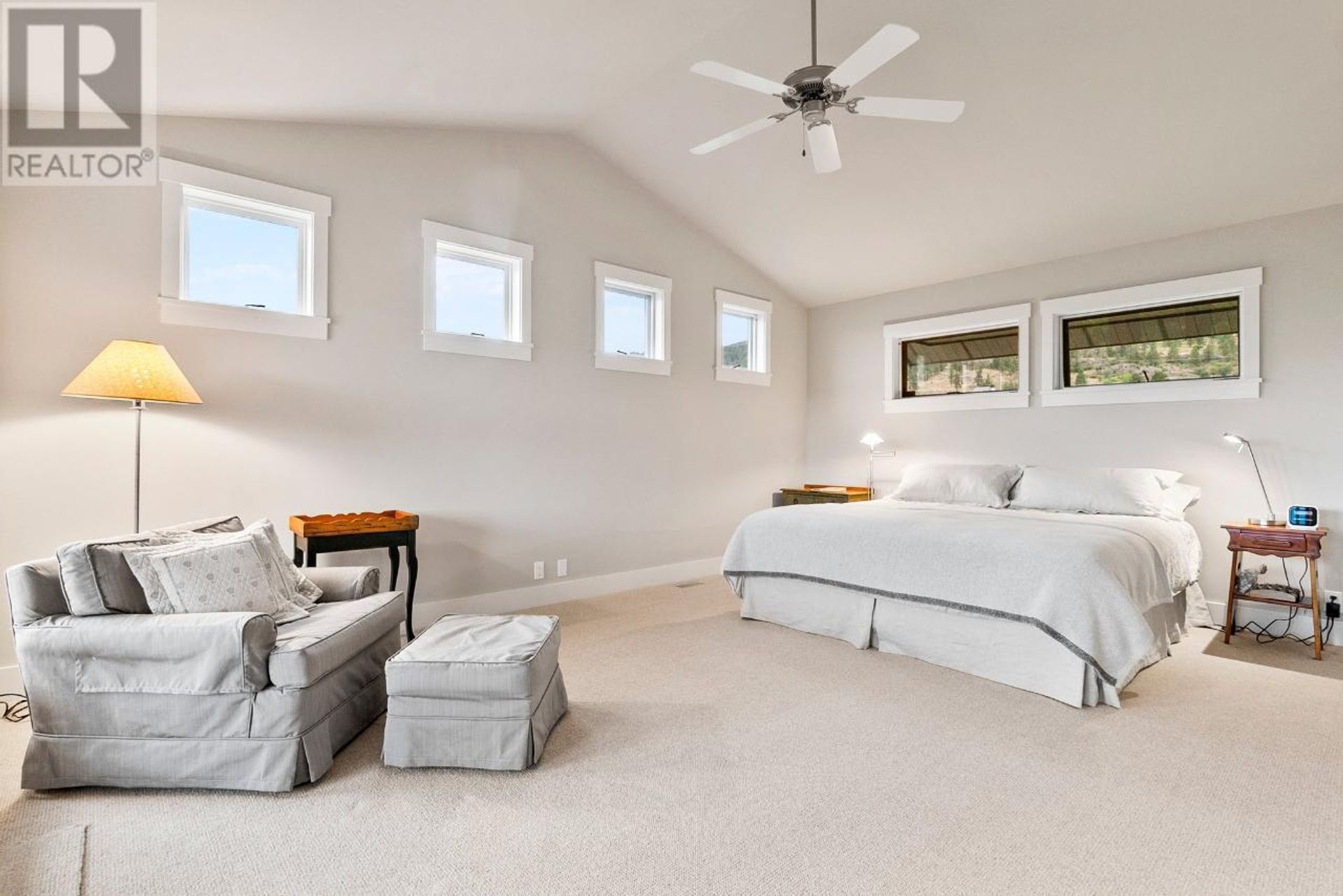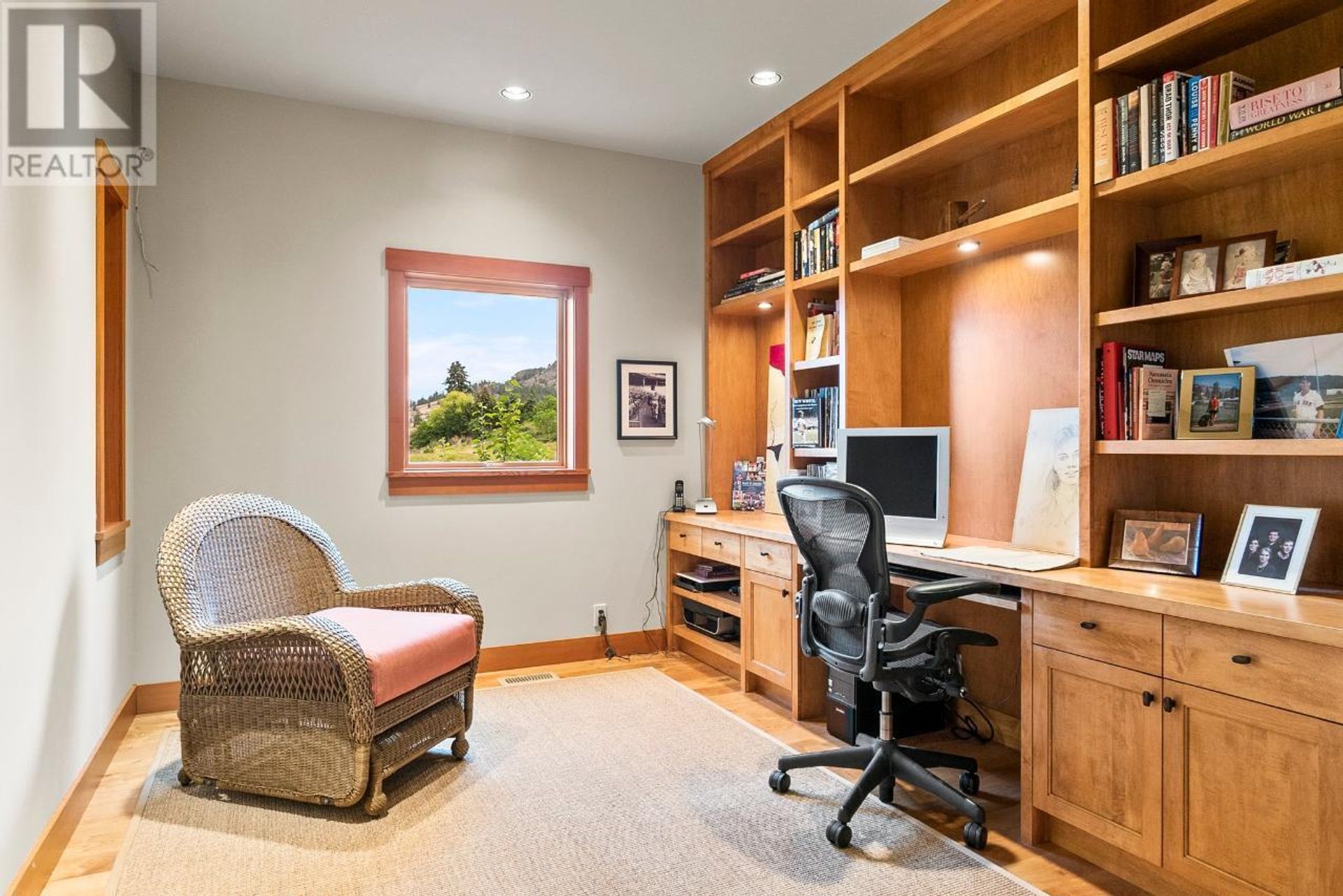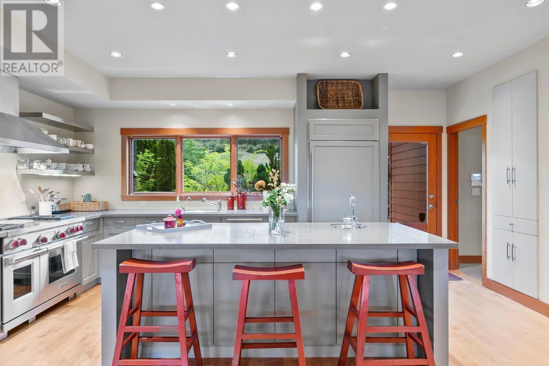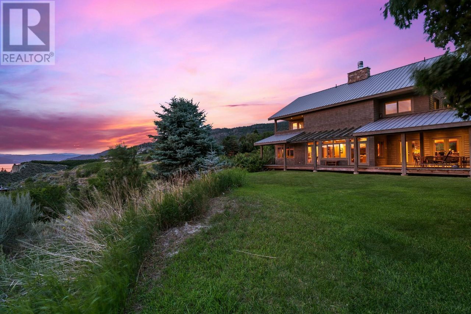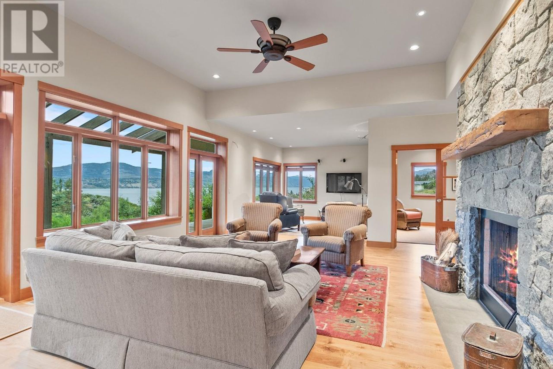 Experience the epitome of elegance & serenity in this Naramata chateaux, a breathtaking 6000+ square foot home nestled in the heart of the scenic Naramata Bench. This luxurious estate boasts captivating panoramic views of both Naramata vineyards & the shimmering waters of Okanagan Lake. Set on 2+ acres of meticulously landscaped grounds w/ fruit trees, this extraordinary property offers an idyllic escape for those seeking the perfect blend of sophistication and natural beauty. Inside is a gourmet kitchen w/ gas double Wolf oven & cooktop, Subzero refrigerator and all matching the custom maple cabinetry w/ granite countertops. Past the elegant living space and stone fireplace is a media space adjacent to his & her offices easily converted into a main level master bedroom. A wrap around covered veranda showcases the sunset views. Upstairs is the master suite w/ private media or workout room. A detached double garage w/ carriage house rounds out the package. Measurements from plans. (id:14735)